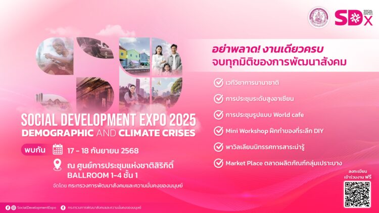กรุงเทพฯ- กระทรวงการพัฒนาสังคมและความมั่นคงของมนุษย์ (พม.) จัดงาน Social Development Expo 2025 (SDx 2025) ภายใต้หัวข้อ “Demographic and Climate Crises” ระหว่างวันที่ 17–18 กันยายน 2568 ณ บอลรูม 1-4 ชั้น 1 ศูนย์การประชุมแห่งชาติสิริกิติ์ เพื่อเป็นเวทีระดับชาติและนานาชาติในการเสริมสร้างความร่วมมือจากภาคีเครือข่ายทุกภาคส่วนของสังคมทั้งในและต่างประเทศ สำหรับการเตรียมความพร้อมรับมือและการจัดการ “วิกฤตซ้อนวิกฤต : โครงสร้างประชากรและสภาพภูมิอากาศ” ซึ่งส่งผลกระทบรุนแรงต่อกลุ่มเปราะบางและประชาชนทุกคน ไม่ว่าจะเป็นเด็ก เยาวชน สตรี ผู้สูงอายุ คนพิการ และผู้ด้อยโอกาสในสังคม