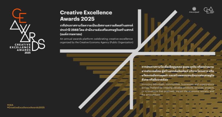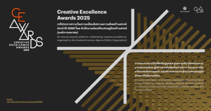สำนักงานส่งเสริมเศรษฐกิจสร้างสรรค์ (องค์การมหาชน) หรือ CEA เดินหน้าผลักดันพลังความคิดสร้างสรรค์ไทยในทุกมิติของการพัฒนาที่สร้างคุณค่า (Value Creation) และผลกระทบเชิงบวก (Impact) ให้กับเศรษฐกิจ สังคม และวัฒนธรรม เตรียมจัดงานประกาศรางวัลความเป็นเลิศทางความคิดสร้างสรรค์ 2568 หรือ Creative Excellence Awards 2025 ในวันพุธที่ 24 กันยายน 2568 เวลา 18.30 – 21.00 น. ณ EMSKYE ชั้น 14 อาคาร EM TOWER ศูนย์การค้าเอ็มสเฟียร์ เพื่อเชิดชูบุคคลและหน่วยงานทั้งภาครัฐและเอกชนที่นำ “ความคิดสร้างสรรค์” มาประยุกต์ใช้ในการสร้างสรรค์ผลงาน ที่สร้างคุณค่าและผลกระทบเชิงบวกต่อเศรษฐกิจ สังคม วัฒนธรรม และสิ่งแวดล้อม ให้แก่ประเทศไทยได้อย่างเป็นรูปธรรม