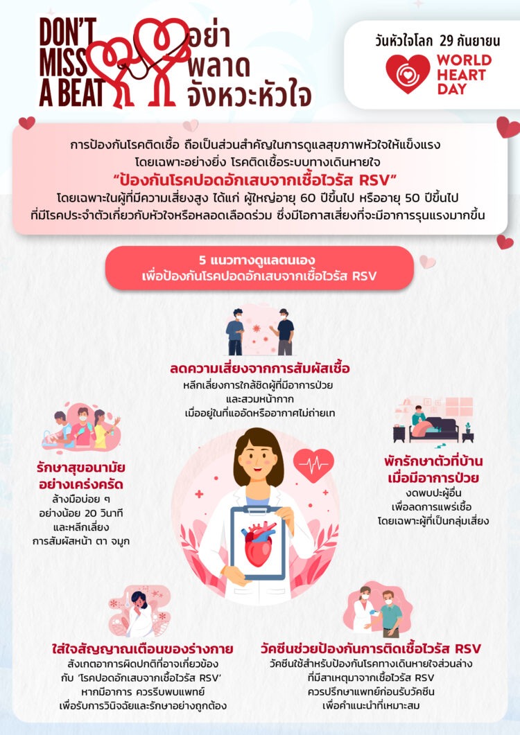 ประเทศไทยพบผู้ป่วยสะสมด้วยโรคหัวใจและหลอดเลือดมากกว่า 2.5 แสนราย และเสียชีวิต ด้วยโรคหัวใจและหลอดเลือดมากถึง 4 หมื่นราย เฉลี่ยชั่วโมงละ 5 คน โดยหนึ่งในผลกระทบที่หลายคนอาจไม่เคยรู้ คือ ผู้ป่วยในจำนวนนี้มีล้วนมีความเสี่ยงต่อการติดเชื้อทางเดินหายใจที่รุนแรงขึ้น เช่น โรคปอดอักเสบจากไวรัสอาร์เอสวี อาร์เอสวีเป็นไวรัสในระบบทางเดินหายใจที่พบได้บ่อยและสามารถป้องกันได้ด้วยวัคซีน อาจก่อให้เกิดอาการที่รุนแรงมากขึ้นในผู้ที่เป็นโรคหัวใจและหลอดเลือด วันหัวใจโลกจึงเป็นการตอกย้ำเพื่อสร้างความตระหนักถึงความเสี่ยงและการดูแลสุขภาพเชิงรุกเพื่อปกป้องสุขภาพหัวใจของทุกคนเพื่อให้หัวใจ ไม่พลาดจังหวะ (Don’t Miss a Beat)