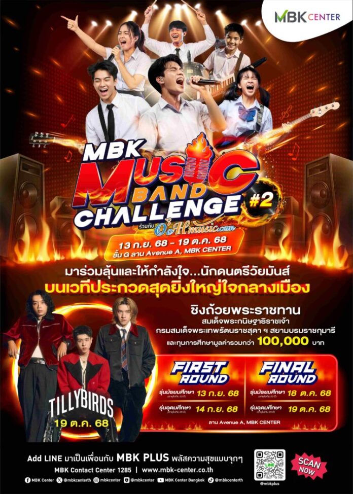 ศูนย์การค้าเอ็ม บี เค เซ็นเตอร์ ชวนชมการแข่งขันรอบชิงชนะเลิศ MBK MUSIC BAND CHALLENGE 2025 ปีที่ 2 ชิงถ้วยพระราชทานสมเด็จพระกนิษฐาธิราชเจ้า กรมสมเด็จพระเทพรัตนราชสุดา ฯ สยามบรมราชกุมารี และ ทุนการศึกษารวมมูลค่ากว่า 100,000 บาท ในวันเสาร์ที่ 18 ตุลาคม 2568 รุ่นมัธยมศึกษา (อายุไม่เกิน 20 ปี) และ วันอาทิตย์ที่ 19 ตุลาคม 2568 รุ่นอุดมศึกษา (อายุไม่เกิน 25 ปี) พร้อมสนุกสุดมันส์กันแบบต่อเนื่องกับศิลปิน วง TILLY BIRDS ณ ชั้น G ลานกิจกรรมเอ็ม บี เค อเวนิว โซน A