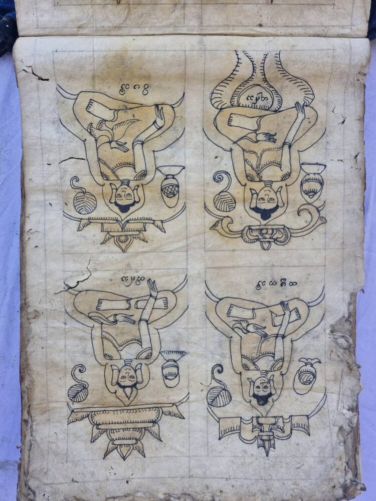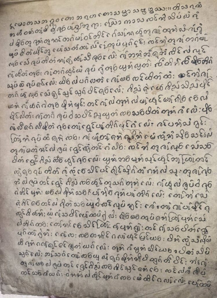 พับหัวกระดาษสา อักษรไทเขิน เรื่อง “พระเจ้า 28 พระองค์” เขียนด้วยหมึกดำ ตัวอักษรยังคมชัดแม้ผ่านมหาอุทกภัย