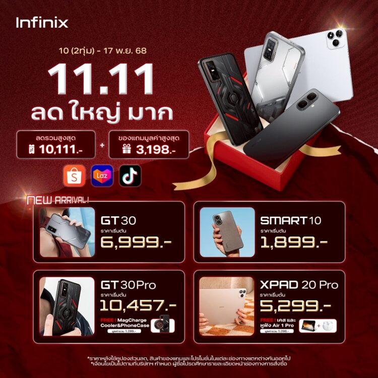 นอกจากความคุ้มค่าจัดเต็มของ Infinix HOT 60i 5G แล้วอินฟินิกซ์ยังขนทัพสมาร์ทโฟนและแกดเจ็ตรุ่นดังมาร่วมโปรแรง 11.11 มอบส่วนลดสูงสุดถึง 10,111 บาท พร้อมของแถมมูลค่ารวมสูงสุด 3,198 บาท และข้อเสนอพิเศษผ่อน 0% สูงสุด 6 เดือน เริ่มจากกลุ่มแท็บเล็ตที่ตอบโจทย์การใช้งานครบจบในเครื่องเดียว XPAD 20 เริ่มต้นราคา 2,999 บาท และ XPAD 20 Pro เริ่มต้นราคา 5,299 บาท พิเศษเมื่อซื้อ XPAD 20 และ XPAD 20 Pro ทุกออเดอร์ รับฟรี เคสกันรอย มูลค่า 499 บาท และ 30 คำสั่งซื้อแรก รับฟรี Air 1 Pro มูลค่า 599บาท ด้านสมาร์ทโฟนเกมมิ่งและระดับเรือธงก็ไม่น้อยหน้ากับ GT 30 Pro ในราคา 10,457 บาทและ GT 30 5G ในราคา 6,999 บาท สำหรับสายทำงานและความบันเทิงต้อง NOTE 50 Pro+ 5G ในราคา 11,370 บาท ส่วนซีรีส์ HOT ที่เน้นความคุ้มค่าคุ้มราคามาพร้อมรุ่นใหม่ล่าสุด HOT 60i 5G ในราคา 4,315 บาทและปิดท้ายด้วยสมาร์ทโฟนสุดคุ้มสำหรับผู้เริ่มต้น อย่าง SMART 10 64 GB เริ่มต้นราคา 1,899 บาท เท่านั้น