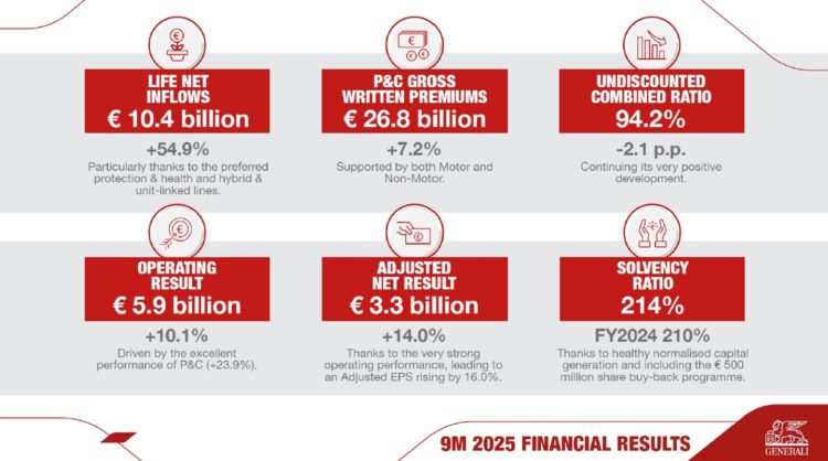 โดยในช่วง 9 เดือนของปี 2025 ผ่านมา เจนเนอราลี่ กรุ๊ป สามารถสร้างการเติบโตอย่างต่อเนื่องเมื่อเทียบกับช่วงเดียวกันของปีก่อน โดยมี เบี้ยประกันภัยรับรวม (Gross Written Premium) อยู่ที่ประมาณ 2.79 ล้านล้านบาท (73.1 พันล้านยูโร) เพิ่มขึ้น 3.7% ขณะที่ ธุรกิจประกันชีวิต (Life Net Inflow) มียอดเงินไหลเข้าสุทธิ อยู่ที่ประมาณ 3.96 แสนล้านบาท (10.4 พันล้านยูโร) ด้านธุรกิจบริหารสินทรัพย์และความมั่งคั่ง (Asset & Wealth Management) ที่ยังคงเติบโตในทิศทางบวก อยู่ที่ 32.16 พันล้านบาท (843 ล้านยูโร) เพิ่มขึ้น 0.7% ส่งผลให้ผลการดำเนินงาน (Operating Result) เพิ่มขึ้นอย่างมีนัยสำคัญเป็น 2.27 แสนล้านบาท (5.9 พันล้านยูโร) เพิ่มขึ้น 10.1% จากผลการดำเนินงานที่แข็งแกร่งของธุรกิจประกันวินาศภัย (P&C) และการสนับสนุนในเชิงบวกจากทุกกลุ่มธุรกิจ