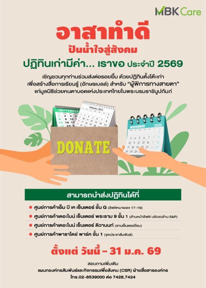 เอ็ม บี เค เซ็นเตอร์ พาราไดซ์ พาร์ค เดอะไนน์ เซ็นเตอร์ พระราม 9 และ เดอะไนน์ เซ็นเตอร์ ติวานนท์ 4 ศูนย์การค้าในเครือเอ็ม บี เค ขอเชิญชวนร่วมบริจาค ปฏิทินตั้งโต๊ะปีเก่า ครั้งที่ 7 ในกิจกรรม ปฏิทินเก่ามีค่า…เราขอ ประจำปี 2569 ภายใต้โครงการ MBK Care อาสาทำดีปันน้ำใจสู่สังคม เพื่อส่งต่อปฏิทินเก่าในการสร้ างสื่อการเรียนรู้ สำหรับผู้พิการทางสายตา ณ มูลนิธิช่วยคนตาบอดแห่ งประเทศไทยในพระบรมราชินูปถัมภ์