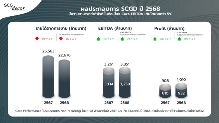 นายนำพล มลิชัย ประธานเจ้าหน้าที่บริ หารและกรรมการผู้จัดการใหญ่ บริษัทเอสซีจี เดคคอร์ จำกัด ( มหาชน ) หรือ SCG Decor (SCGD) ผู้นำธุรกิจวัสดุตกแต่งพื้นผิ วและสุขภัณฑ์ในภูมิภาคอาเซียน กล่าวว่า “ ผลประกอบการ ไม่รวมรายการพิเศษ ปี 2568 EBITDA อยู่ที่ 3,351 ล้านบาท และมีกำไรสำหรับปีอยู่ที่ 1,010 ล้านบาท ปรับตัวเพิ่มขึ้น 3% และ 11% จากปีก่อน มีรายได้ 22,676 ล้านบาท ลดลง 11% จากปีก่อน และหากไม่รวมผลกระทบของค่าเงิ นบาทแข็งค่าด้วยแล้ว EBITDA และกำไร สำหรับปี จะ ดีขึ้น 7% จากปีก่อน และ 15% จากปีก่อน ตามลำดับ