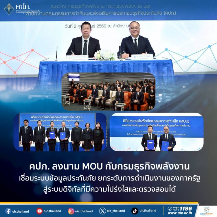 เมื่อวันที่ 2 กุมภาพันธ์ 2569 สำนักงานคณะกรรมการกำกับและส่ งเสริมการประกอบธุรกิจประกันภัย (สำนักงาน คปภ.) จัดพิธี ลงนามบันทึกข้อตกลงความร่วมมื อว่าด้วยการเชื่อมโยงข้อมู ลการประกันภัยตามกฎหมายว่าด้ วยการควบคุมน้ำมันเชื้อเพลิง เพื่อใช้ประโยชน์ ในการพิจารณาออกใบอนุญาตและกำกั บดูแลการประกอบกิจการควบคุ มประเภทที่ 3 ระหว่างกรมธุรกิจพลังงาน กระทรวงพลังงาน กับสำนักงาน คปภ. โดยมี นายชูฉัตร ประมูลผล เลขาธิการ คปภ. และ นายสราวุธ แก้วตาทิพย์ อธิบดีกรมธุรกิจพลังงาน เป็นผู้ลงนาม ณ ห้องประชุมสถาบันวิทยาการประกั นภัย ชั้น 2 สำนักงาน คปภ.