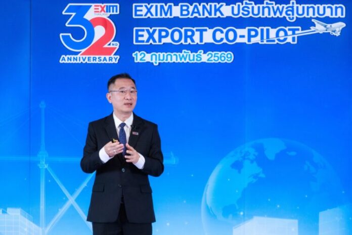 12ก.พ.2569/ นายชลัช รัตนบุญนิธิ กรรมการผู้จัดการ ธนาคารเพื่อการส่งออกและนำเข้าแห่งประเทศไทย (EXIM BANK) แถลงนโยบายและบทบาท EXIM BANK ในโอกาสที่ธนาคารจะเปิดดำเนินงานอย่างเป็นทางการครบ 32 ปี ก้าวสู่ปีที่ 33 ซึ่งตรงกับวันที่ 17 กุมภาพันธ์ในปีนี้ ณ EXIM BANK สำนักงานใหญ่ เมื่อวันที่ 12 กุมภาพันธ์ 2569 ว่า เศรษฐกิจโลกยังคงเผชิญความเปราะบางและความผันผวนสูงจากความเสี่ยงรอบด้าน ทั้งสงครามการค้า ความตึงเครียดทางภูมิรัฐศาสตร์ที่ทวีความรุนแรงขึ้นและยืดเยื้อ ส่งผลต่อห่วงโซ่อุปทาน การค้า และการลงทุนทั่วโลก