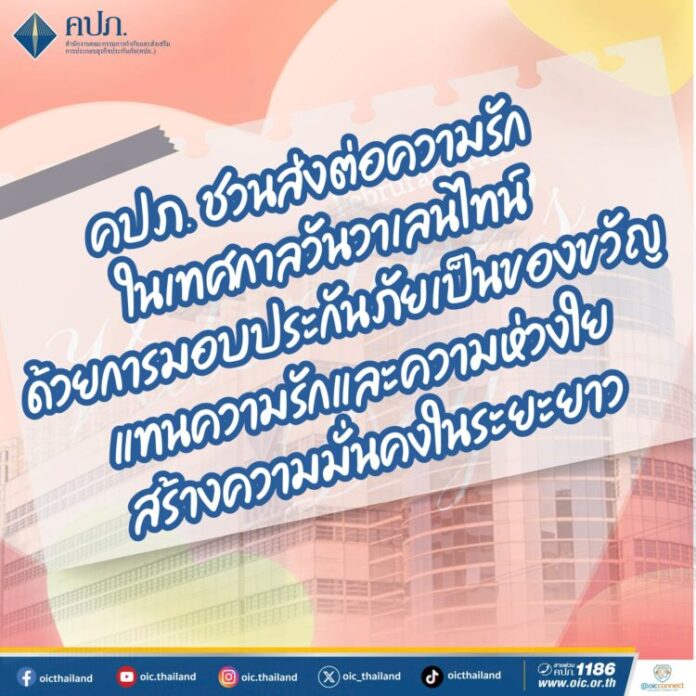 ในโอกาสพิเศษดังกล่าว สำนักงานคณะกรรมการกำกับและส่ งเสริมการประกอบธุรกิจประกันภัย (สำนักงาน คปภ.) ขอร่วมเป็นส่วนหนึ่งในการเฉลิ มฉลองเทศกาลแห่งความรัก ด้วยการเชิญชวนประชาชนเปลี่ ยนความรักและความห่วงใยให้เป็ นหลักประกันความมั่นคงในระยะยาว ผ่านการมอบผลิตภัณฑ์ประกันภั ยเป็นของขวัญที่มีคุณค่า เพื่อสื่อแทนคำบอกรักและ ความห่วงใยอย่างยั่งยืน โดยมีผลิตภัณฑ์ประกันภัยให้เลื อกหลากหลายไม่ว่าจะเป็นการประกั นชีวิต อาทิ ประกันชีวิตแบบตลอดชีพ ที่ให้ความคุ้มครองระยะยาว เหมาะสำหรับเป็นหลักประกันให้ ครอบครัวหรือการส่งต่อมรดก ประกันชีวิตแบบออมทรัพย์ ที่เน้นการออมเงินควบคู่ความคุ้ มครอง ประกันชีวิตแบบบำนาญ เพื่อการวางแผนเกษียณอายุ และประกันชีวิตควบการลงทุน (Unit-Linked) ซึ่งผสมผสานความคุ้มครองชีวิ ตและการลงทุน เพื่อเพิ่มโอกาสในการเติ บโตของเงินออมตามเป้ าหมายทางการเงินของแต่ละบุคคล ทั้งนี้ ยังสามารถเลือกซื้อสัญญาเพิ่ มเติมแนบกับกรมธรรม์หลัก เช่น ประกันภัยสุขภาพ ประกันภัยโรคร้ายแรง หรือประกันภัยอุบัติเหตุ เพื่อเสริมความคุ้มครองให้ ครอบคลุมความเสี่ยงในชีวิ ตประจำวันได้อย่างเหมาะสม หรือแม้แต่ ประกันอัคคีภัยและประกันภัยที่ อยู่อาศัย เพื่อคุ้มครองทรัพย์สินและที่ อยู่อาศัยจากความเสี่ยงที่ อาจเกิดขึ้นโดยไม่คาดคิด ซึ่งล้วนเป็นทางเลือกในการบริ หารความเสี่ยงอย่างเป็นระบบ และช่วยวางรากฐานชีวิตเพื่ ออนาคตที่มั่นคงและยั่งยืน