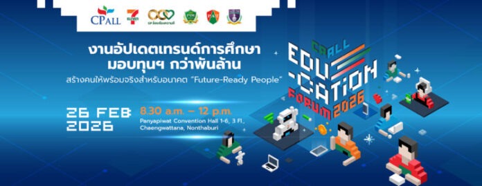 ผู้สนใจสามารถเข้าร่วมงาน CP ALL Education Forum 2026 วันพฤหัสบดี ที่ 26 กุมภาพันธ์ 2569 เวลา 08.30 – 12.00 น. ณ ฮอลล์ 1–6 ชั้น 3 อาคารหอประชุม สถาบันการจัดการปัญญาภิวัฒน์ จังหวัดนนทบุรี เพื่อร่วมค้นหาคำตอบว่า การศึกษาไทยจะเตรียมคนอย่างไร ที่ไม่จำเป็นต้องวิ่งตามโลก แต่สามารถออกแบบคนที่โลกต้องการ