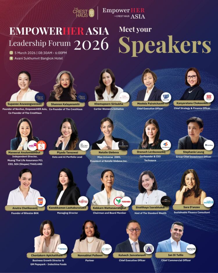 ต้อนรับวันสตรีสากล 2569 The CrestHaus ขอเชิญทุกท่านร่วมเปิดประสบการณ์กับสุดยอดเวทีเสวนาเพื่อผู้นำหญิงครั้งยิ่งใหญ่ในเอเชีย เวทีรวมผู้หญิงเก่งแนวหน้าระดับบอร์ดและผู้บริหารองค์กร จากองค์กรระดับชาติและเอเชีย ไว้มากที่สุด ในงานเสวนา “EmpowerHER Asia Leadership Forum 2026” ภายใต้แนวคิด “Write Your Next Chapter” สนับสนุนให้คุณ “กล้าเขียนอนาคตการเป็นผู้นำในแบบฉบับของตัวเอง” งานเสวนาที่พร้อมผลักดันให้ผู้หญิงก้าวข้ามขีดจำกัด กล้าคิดกล้าทำ และมีจุดยืนที่ชัดเจนด้วยการออกแบบกรอบความคิดใหม่ๆ ผ่านการแบ่งปันองค์ความรู้ในเชิงกลยุทธ์ที่หลากหลาย จากผู้นำหญิงระดับบอร์ดและ C-Suite ที่ประสบความสำเร็จจากหลายองค์กร เพื่อก้าวสู่การเป็นผู้นำที่สามารถกำหนดทิศทางในอนาคตทั้งระดับองค์กรและสังคม วันที่ 5 มีนาคม 2569 นี้ ณ โรงแรม อวานี สุขุมวิท กรุงเทพฯ