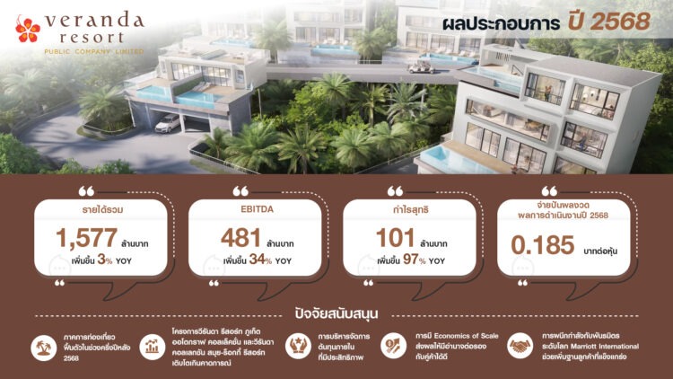 ส่วนภาพรวมผลการดำเนินงานตลอดปี 2568 บริษัทฯ มีรายได้รวมทั้งสิ้น 1,577 ล้านบาท เติบโต 3% (YoY) โดยรายได้จากกลุ่มธุรกิทั้งนี้ ภาพรวมกลุ่มธุรกิจโรงแรมของวีรั นดาฯ เติบโตได้ตามเป้าหมายที่วางไว้ จากการฟื้นตัวอย่างต่อเนื่ องของภาคการท่องเที่ยวในท้ายปี 2568 ส่งผลให้ไตรมาส 4/2568 ราคาค่าห้องพักเฉลี่ย (ADR) เติบโต 10% และรายได้เฉลี่ยต่อห้อง (RevPAR) ปรับตัวสูงขึ้น 7% โดยมีแรงขั บเคลื่อนหลักจากโครงการ “วีรันดา รีสอร์ท ภูเก็ต ออโตกราฟ คอลเล็คชั่น” ที่ทำรายได้สูงกว่าคาดการณ์ และ “วีรันดา คอลเลกชัน สมุย – ร็อคกี้ รีสอร์ท” ที่ทำผลงานได้โดดเด่น เนื่องจากทั้ง 2 โครงการตั้งอยู่ในทำเลศักยภาพ (Prime Location) ซึ่งช่วยลดผลกระทบจากปัจจั ยภายนอกได้ดี