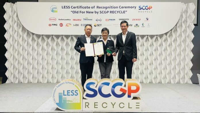บริษัท เอ็ม บี เค จำกัด (มหาชน) นำโดย นางสาวศตกมล วรกุล ผู้อำนวยการอาวุโสฝ่ายสื่ อสารองค์กร บริษัท อินเทลลิเจ้นท์ ครีเอทีฟ แอนด์ มาร์เก็ตติ้ง จำกัด (ที่ 2 จากซ้าย) เป็นผู้แทนบริษัท ฯ รับมอบโล่พร้อมใบประกาศเกียรติ คุณ ที่ได้รับการประเมินว่ าสามารถลดก๊าซเรือนกระจกได้ 63.322 ตันคาร์บอนไดออกไซด์เทียบเท่า ในโครงการสนับสนุนกิจกรรมลดก๊ าซเรือนกระจก (Low Emission Support Scheme: LESS) ภายใต้โครงการ “Old For New โดย SCGP RECYCLE” โดยมีนายณกรณ์ ตรรกวิรพัท ผู้อำนวยการองค์การบริหารจั ดการก๊าซเรือนกระจก (องค์การมหาชน) (ที่ 1 จากซ้าย) และ นายดนัยเดช เกตุสุวรรณ ประธานเจ้าหน้าที่ บริหารสายการเงิน บริษัท เอสซีจี แพคเกจจิ้ง จำกัด (มหาชน) (ที่ 3 จากซ้าย) เป็นผู้มอบ ณ อาคารอเนกประสงค์ สำนักงานใหญ่ SCG บางซื่อ กรุงเทพฯ เมื่อเร็ว ๆ นี้