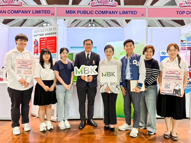นางสาวศตกมล วรกุล ผู้อำนวยการอาวุโสฝ่ายสื่อสารองค์กร บริษัท อินเทลลิเจ้นท์ ครีเอทีฟ แอนด์ มาร์เก็ตติ้ง จำกัด (ที่ 5 จากซ้าย) ผู้บริหารธุรกิจในเครือเอ็ม บี เค พร้อมด้วย ดร.สิทธิเดช พงศ์กิจวรสิน รองอธิการบดี กำกับดูแลด้านการจัดการทรัพย์สิน จุฬาลงกรณ์มหาวิทยาลัย จำกัด (ที่ 4 จากซ้าย) ร่วมเยี่ยมชมงาน Chula Job and Higher Education Fair 2026 ซึ่งจัดเพื่อให้นิสิตได้เห็นโอกาสในเส้นทางอาชีพและการเรียนต่อ โดยทางเอ็ม บี เค ร่วมกับพันธมิตรในการออกบูธแนะนำองค์กร เพื่อแนะนำนิสิต นักศึกษาได้รู้จัก พร้อมสัมผัสประสบการณ์ในโลกการทำงานจริง ณ ศาลาพระเกี้ยว จุฬาลงกรณ์มหาวิทยาลัย เมื่อเร็ว ๆ นี้