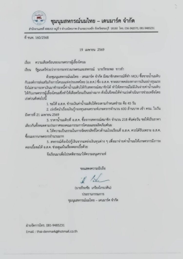 นายวัชระพล ขาวขำ รัฐมนตรีช่วยว่าการกระทรวงเกษตรและสหกรณ์ เดินทางไปรับฟังปัญหาของชุมนุมสหกรณ์โคนมไทย–เดนมาร์ค จำกัด ด้วยตนเอง โดยใช้เวลาหารือร่วมกับตัวแทนสหกรณ์นานกว่า 2 ชั่วโมง เพื่อเปิดโอกาสให้แต่ละสหกรณ์สะท้อนปัญหาและข้อเสนอแนะอย่างเต็มที่โดยชุมนุมสหกรณ์โคนมไทย–เดนมาร์ค ได้ยื่นข้อเรียกร้องต่อภาครัฐหลายประเด็นได้แก่ ขอให้องค์การส่งเสริมกิจการโคนมแห่งประเทศไทย (อ.ส.ค.) ชำระเงินค่าน้ำนมดิบให้เป็นไปตามกำหนดภายใน 45 วัน เร่งผลักดันเงินกู้กองทุนสงเคราะห์เกษตรกร วงเงิน 600 ล้านบาท เพื่อนำมาชำระค่าน้ำนมดิบค้างจ่าย กำหนดราคารับซื้อน้ำนมดิบให้เป็นราคาเดียวตามประกาศคณะกรรมการโคนมและผลิตภัณฑ์นม (Milk Board) หลังที่ผ่านมา อ.ส.ค. ขอปรับลดราคารับซื้อน้ำนมดิบต่ำกว่าที่กำหนด โดยอ้างเหตุผลด้านสภาพคล่องทางการเงิน รวมถึงการจัดสรรโควตานมโรงเรียนอย่างเป็นธรรม และการช่วยเหลือภาระดอกเบี้ยเงินกู้ของสหกรณ์