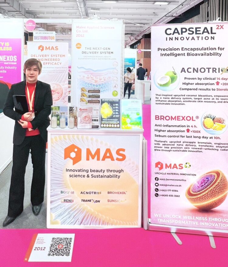 ภายในงาน MAS ได้นำเสนอผลงานนวัตกรรม BROMEXOL® วัตถุดิบนวัตกรรมนำส่งเอนไซม์บรอมิเลน (Bromelain) สารสำคัญจากเปลือกสับปะรด เข้าร่วมประกวดรางวัล “Best Active Ingredient Awards 2026” ใน Innovation Zone โดยชูจุดเด่นของเทคโนโลยีห่อหุ้ม CAPSEAL2X ที่ผสานแนวคิด Thainess Upcycled Plant Bioactives นำวัตถุดิบเหลือใช้ทางการเกษตรจากเปลือกสับปะรดมาเพิ่มมูลค่าเชิงนวัตกรรมสู่ภาคอุตสาหกรรมความงาม