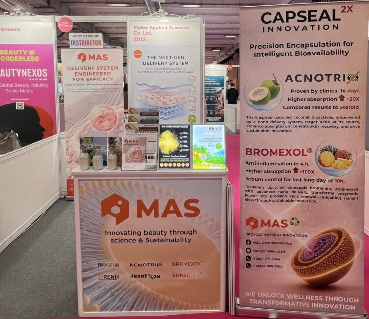 นอกจากนี้ MAS ยังนำเสนอวัตถุดิบจากนวัตกรรม Encapsulation and Delivery Systems มากกว่า 10 รายการ ซึ่งถูกออกแบบให้ทำงานอย่างแม่นยำในแต่ละระดับความลึกของชั้นผิว มุ่งเป้าการทำงานในระดับเซลล์ ครอบคลุมทั้งการปกป้องผิวจากแสงแดด (Sun Protection) การเพิ่มความกระจ่างใส (Skin Brightening) การดูแลปัญหาฝ้าและจุดด่างดำ (Melasma Treatment) ตลอดจนการฟื้นฟูผิวและลดเลือนริ้วรอย (Skin Rejuvenation & Anti-Wrinkle) สะท้อนถึงศักยภาพของเทคโนโลยีไทยที่สามารถแข่งขันในระดับสากลได้อย่างแท้จริง