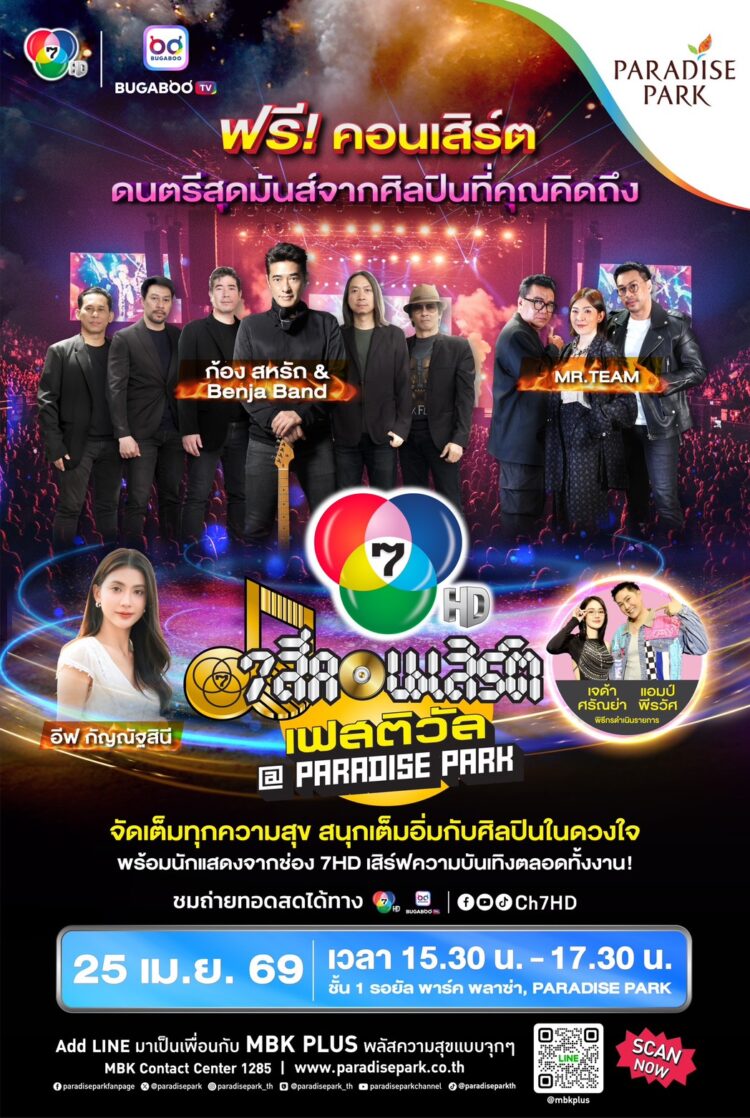 ซัมเมอร์นี้เตรียมตัวให้พร้อม แล้วออกมาสนุกกันต่อกับ ฟรี! คอนเสิร์ตสุดฟีลกู๊ดที่ หลายคนรอคอย พาราไดซ์ พาร์ค ศูนย์การค้าในเครือเอ็ม บี เค ร่วมกับ ช่อง 7HD ชวนทุกคนย้อนความสุขวันวาน จัดเต็มความบันเทิงในงาน 7 สีคอนเสิร์ต เฟสติวัล @ Paradise Park” ที่ขนทัพศิลปินคุ ณภาพมามอบความสุขแบบใกล้ชิด และในครั้งนี้พบกับศิลปินระดั บคุณภาพ “ก้อง สหรัถ & Benja Band” นักร้องเสียงอบอุ่นที่เต็มไปด้ วยเสน่ห์เฉพาะตัว เพิ่มดีกรีความมันส์กับวงดนตรี ป๊อปร็อกระดับตำนาน “MR.TEAM” ที่เตรียมเพลงฮิตมาให้แฟน ๆ ได้ร้องตามกันแบบจัดเต็ม เสริมทัพด้วยแขกรับเชิญ “อีฟ กัญณัฐสินี” นักแสดงจากช่อง 7HD ที่จะมาร่วมสร้างสีสั นและความสนุกตลอดทั้งงาน พร้อมด้วย 2 พิธีกร มากความสามารถ “เจด้า ศรัณย่า” และ “แอมป์ พีรวัศ”