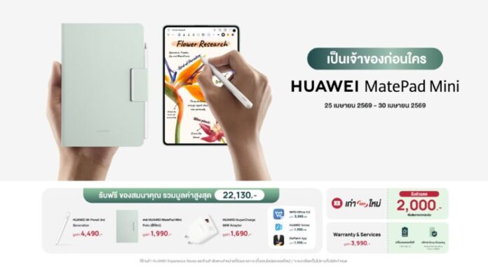 HUAWEI MatePad Mini เตรียมเปิดให้พรีออเดอร์เป็นเจ้าของก่อนใคร ตั้งแต่วันที่ 25 เมษายน 2569 ถึง 30 พฤษภาคม 2569 พร้อมรับสิทธิพิเศษและของสมนาคุณรวมมูลค่าสูงสุด 22,130 บาท ได้แก่ HUAWEI M-Pencil 3rd Generation มูลค่า 4,490 บาท, เคส HUAWEI MatePad Mini Folio สีเขียว มูลค่า 1,990 บาท, HUAWEI SuperCharge 66W Adapter มูลค่า 1,690 บาท พร้อมแอปพลิเคชันที่ติดตั้งมาให้ใช้งานฟรี ได้แก่ WPS Office 3.0 มูลค่า 3,990 บาท, HUAWEI Notes มูลค่า 1,990 บาท และ GoPaint App มูลค่า 1,990 บาท นอกจากนี้ยังได้รับบริการ Warranty & Services มูลค่า 3,990 บาท ซึ่งครอบคลุมการเปลี่ยนแบตเตอรี่ฟรี 1 ครั้ง ภายใน 3 ปี และบริการ Deep Cleaning สำหรับหน้าจอ PaperMatte จำนวน 2 ครั้งต่อปี (แนะนำให้ลงทะเบียนรับสิทธิ์ภายใน 30 วันหลังซื้อ และใช้สิทธิ์ได้ภายในปีแรกของการใช้งาน) และสำหรับลูกค้าที่ต้องการอัปเกรด ยังมีโปรโมชันเก่าแลกใหม่ รับส่วนลดเพิ่มจากราคาประเมินอีก 2,000 บาท สามารถสั่งจองได้ผ่านหน้าร้าน HUAWEI Experience Store ร้านค้าตัวแทนจำหน่ายที่ร่วมรายการ และช่องทางออนไลน์อย่าง HUAWEI Store, Lazada, Shopee และ TikTok Shop