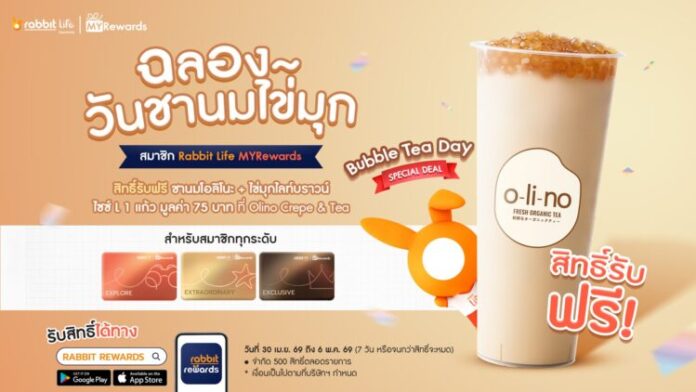 กรุงเทพฯ 23 เมษายน 2569 – บริษัท แรบบิท ประกันชีวิต จำกัด (มหาชน) หรือ Rabbit Life บริษัทในเครือบริษัท บีทีเอส กรุ๊ป โฮลดิ้งส์ จำกัด (มหาชน) ชวนสมาชิก Rabbit Life MYRewards ฉลอง“วันชานมไข่มุกแห่งชาติ” แบบคูล ๆ กับแคมเปญ “Bubble Tea Day Special Deal” บอกเลยสายชานมต้องห้ามพลาด เพียงกดรับสิทธิ์ก็รับฟรีทันที “ชานมโอลิโนะ พร้อมไข่มุกไลท์บราวน์” ไซซ์ L จำนวน 1 แก้ว มูลค่า 75 บาท จากร้าน O-lino Crepe & Tea (เฉพาะสาขาที่ร่วมรายการ) พร้อมให้ซัมเมอร์นี้ได้จิบชานมเย็น ๆ เคี้ยวไข่มุกหนึบ ๆ เติมความฟินให้วันชิล ๆ สนุกขึ้นอีกระดับ โดยสามารถกดรับสิทธิ์ได้ง่าย ๆ ผ่านแอปพลิเคชัน Rabbit Rewards ตั้งแต่วันที่ 30 เมษายน 2569 – 6 พฤษภาคม 2569 หรือจนกว่าสิทธิ์จะหมด ใครไว ได้ฟินก่อน แล้วมาฉลองวันชานมไข่มุกไปด้วยกัน สิทธิพิเศษนี้สำหรับสมาชิก Rabbit Life MYRewardsเท่านั้น!