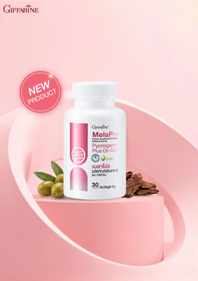 บริษัท กิฟฟารีน สกายไลน์ ยูนิตี้ จำกัด แนะนำไอเท็มเด็ด ผลิตภัณฑ์เสริมอาหาร “Giffarine MelaPro” (กิฟฟารีน เมลาโปร) ครั้งแรกของการรวมพลัง 2 สารสำคัญที่สกัดจากธรรมชาติ ที่มีงานวิจัยรับรองถึงประสิทธิภาพในการดูแลผิวในเรื่องฝ้าแบบ multi-mechanistic ผสานพลังจาก PYCNOGENOL® สารสกัดจากเปลือกสนมาริไทม์ฝรั่งเศส และ OLI-OLATM สารสกัดจากมะกอก ช่วยส่งผลดีต่อการ balance ความเข้มของเม็ดสีผิว ความชุ่มชื้น และความยืดหยุ่น จึงเปรียบเสมือนการใส่ Filter ให้ผิวคลายความกังวลในการเกิดฝ้า และจุดด่างดำ นอกจากนี้ยังช่วยต้านอนุมูลอิสระที่เกิดจากแสงสีฟ้า ผิวจึงแลดูสุขภาพดี อีกทั้งยังส่งผลดีต่อการไหลเวียนเลือด รวมถึงสุขภาพหัวใจและหลอดเลือด กิฟฟารีน เมลาโปร จึงเป็นตัวช่วยเพิ่มพลังการดูแลผิว ให้ผิวคุณสวยระดับ World Class ได้ไม่ยาก ขนาด 30 แคปซูล ราคา 980 บาท